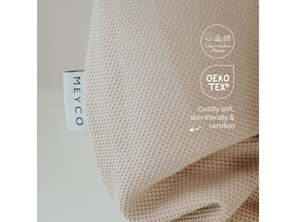 Spací pytel s nožičkami je bez podšívky vyrobený z měkké dvouvrstvé látky: uvnitř je ze 100% bavlněného žerzeje, vnější strana je z 58% bavlny, 39% polyesteru a 3% elastanu.