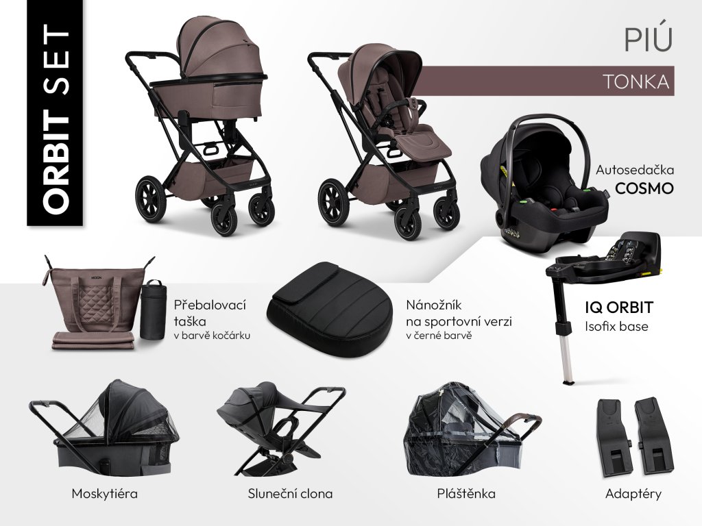 Výhodná sada PIÚ ORBIT obsahuje nánožník black na sportovní verzi, autosedačku COSMO Black, Isofix IQ ORBIT, přebalovací tašku, moskytiéru, sluneční clonu, pláštěnku a adaptéry na autosedačku.