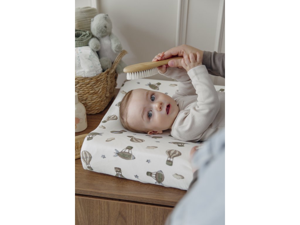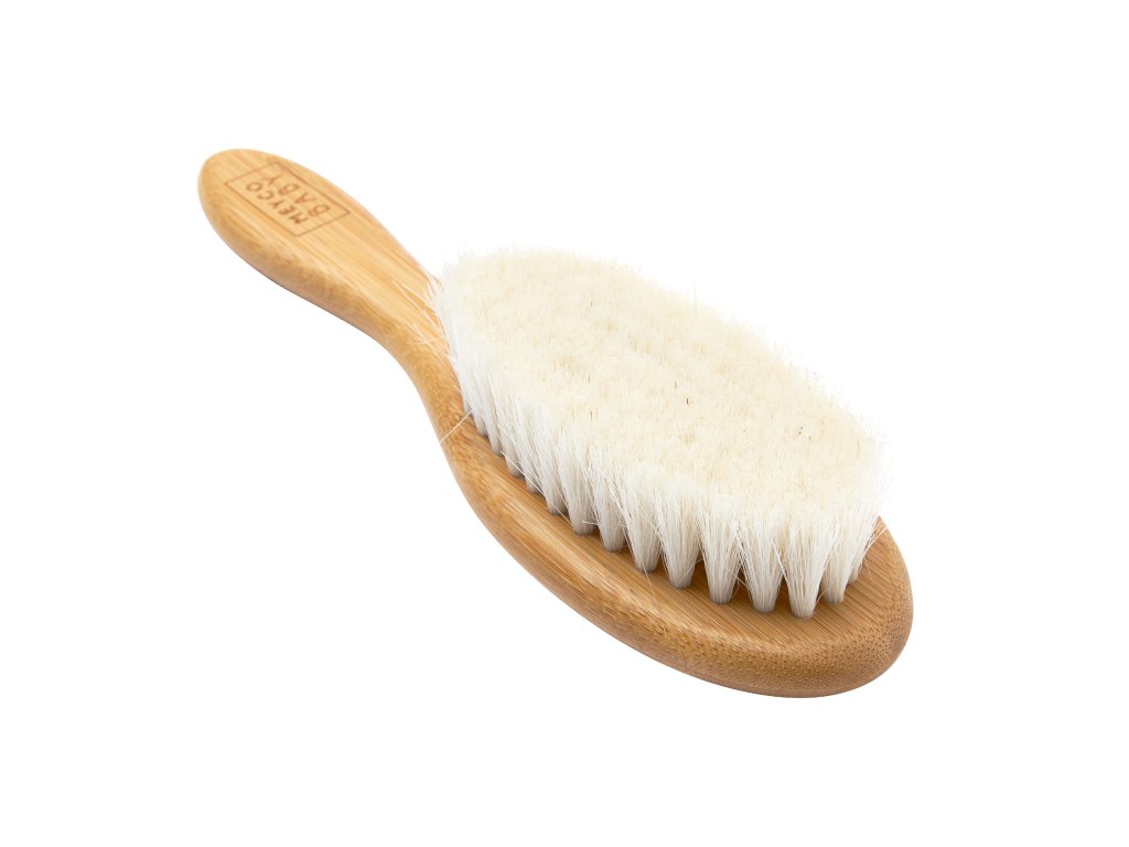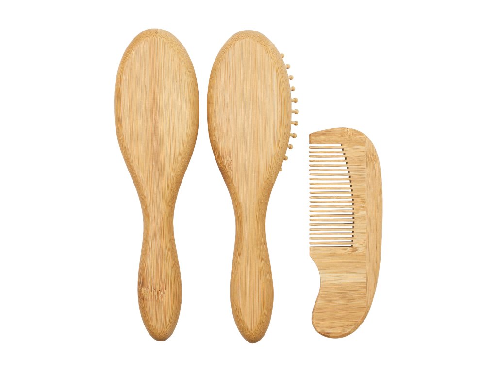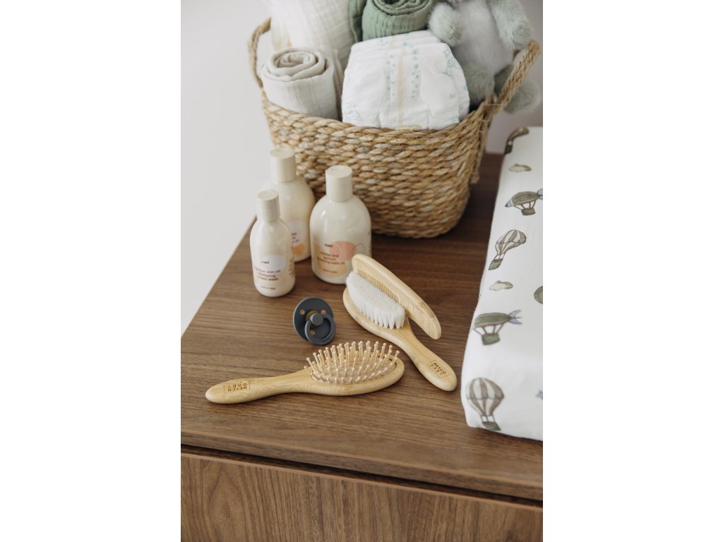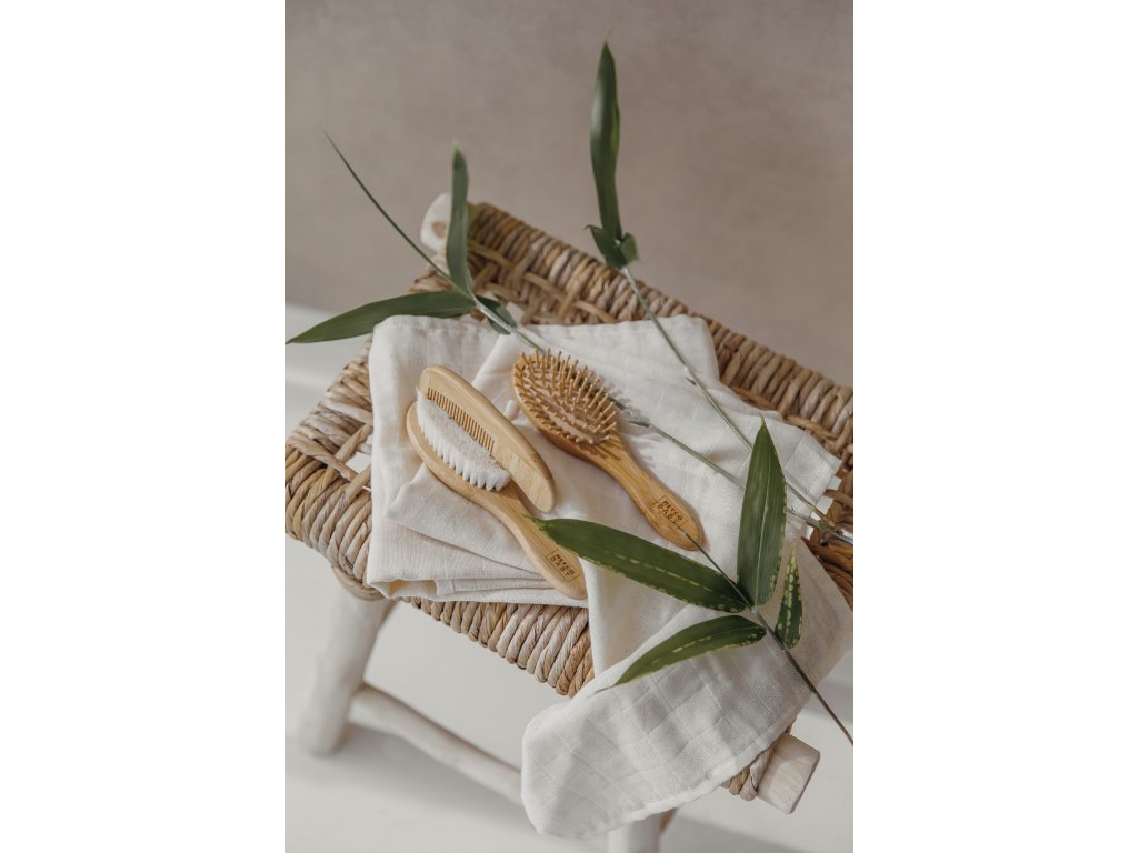 Sada obsahuje dřevěný hřeben, kartáč s hebkou kozí srstí pro citlivou pokožku hlavy vašeho miminka a bambusový kartáč pro hustší vlasy.
