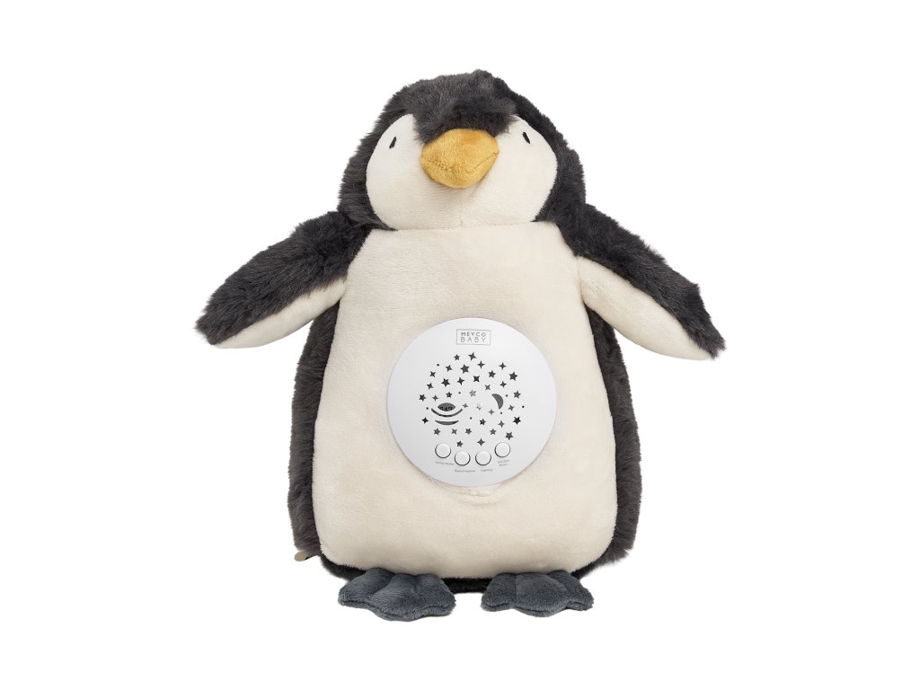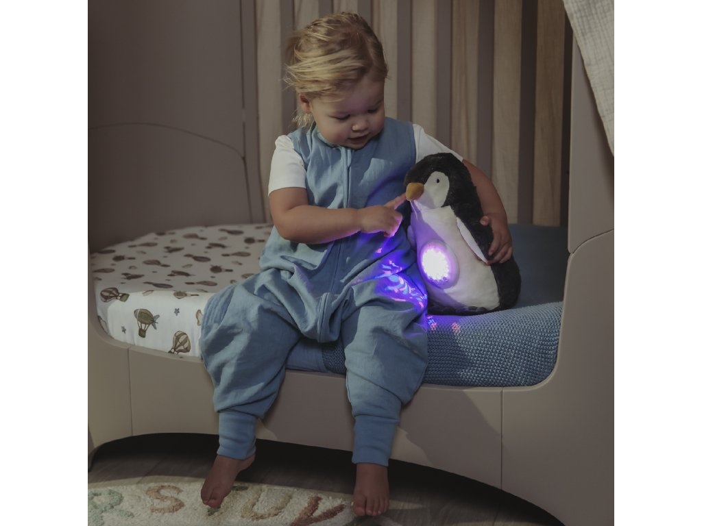 Kamarád zahraje 10 uklidňujících ukolébavek, které se automaticky prolínají jedna z druhé. Kromě toho tučňák vykazuje různé bílé šumy, jako je tlukot srdce, tekoucí voda, zvuky žab a mnoho dalšího. Tyto zvuky pomáhají snížit hluk v pozadí a umožňují dítěti snadněji se uvolnit. Díky vestavěnému hvězdnému projektoru promítá parťák uklidňující světelný vzor na strop nebo zeď. Jedním stiskem tlačítka můžete přepínat mezi 9 různými světelnými efekty v červené, zelené a modré barvě, nebo světlo úplně vypnout. Když jsou zapnuty jak zvuk, tak světlo, parťák automaticky přepne do režimu spánku po 30 minutách, takže vaše dítě může klidně spát.